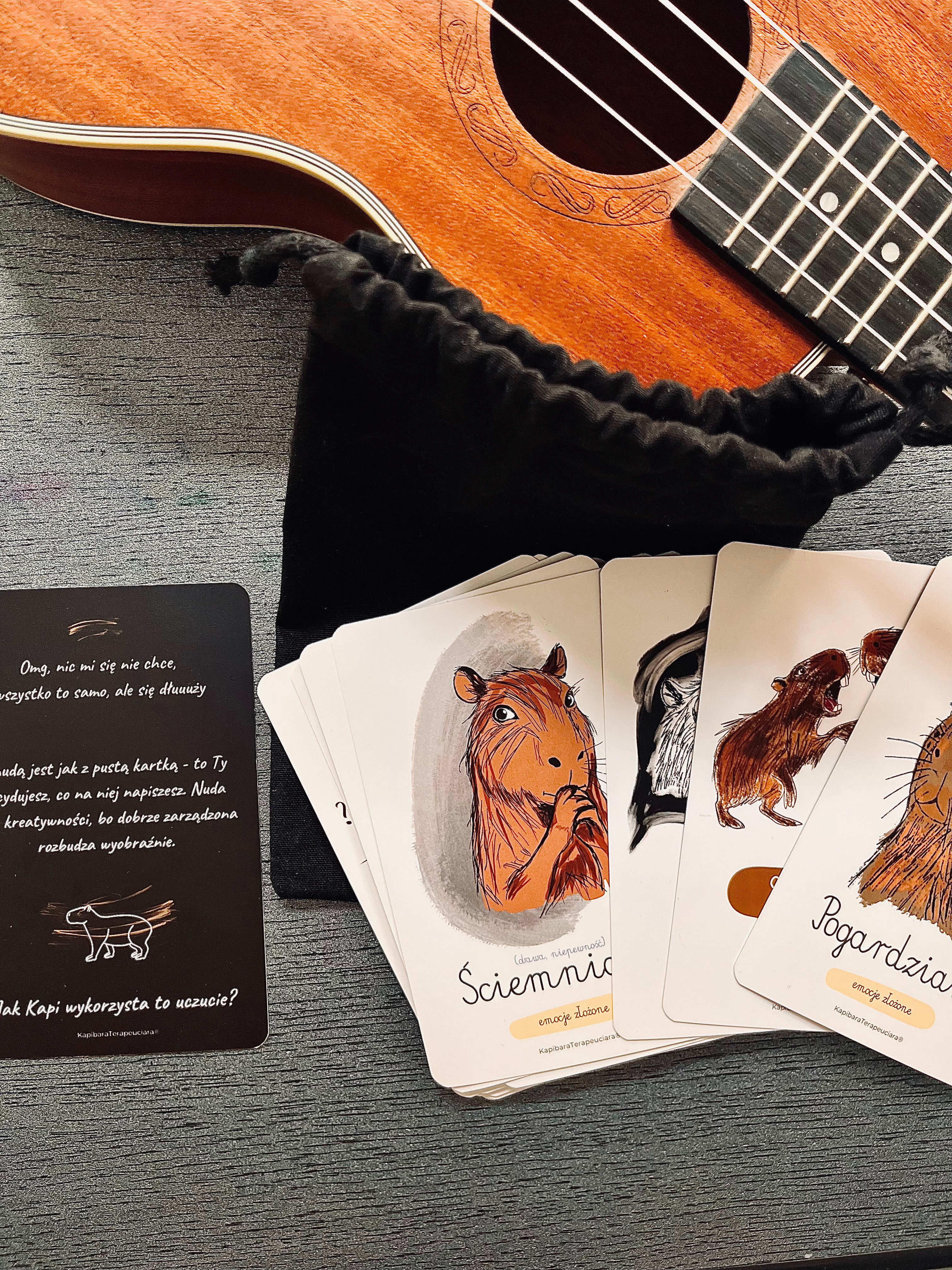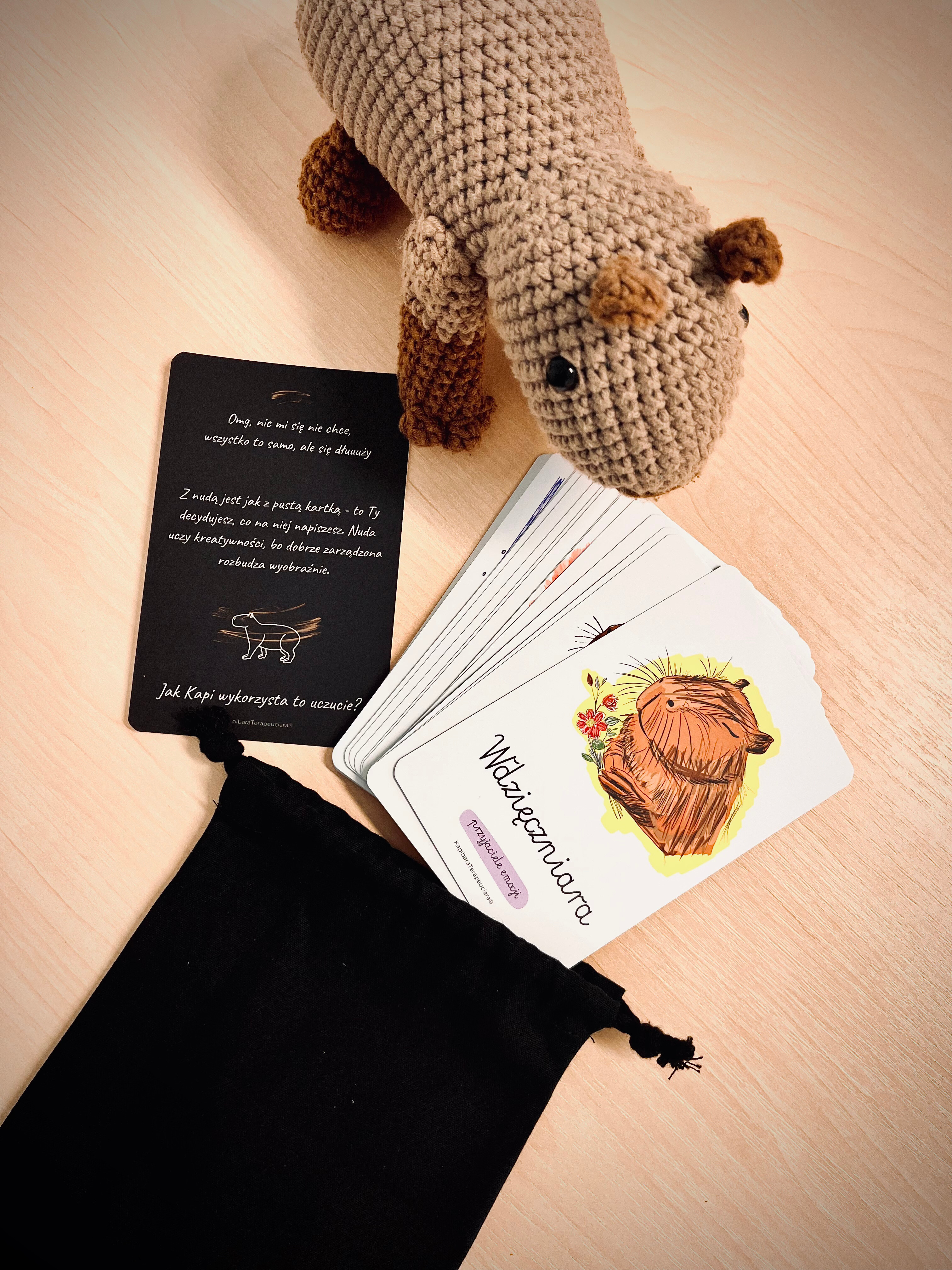 Każda karta to inna emocja lub pomocnik emocji – od radości po konflikty grupowe. Na awersie znajdziesz piękne ilustracje Kapibary, a na rewersie inspirujące cytaty oraz wyjaśnienie. Karty są spakowane w minimalistyczny czarny bawełniany woreczek ze sznurkiem.
